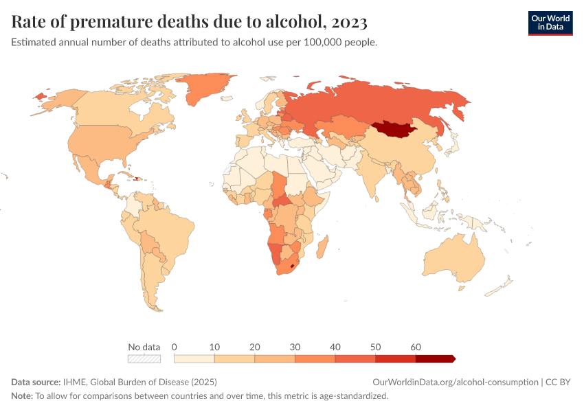 We see large geographical differences: Alcohol consumption across North Africa and the Middle East is particularly low — in many countries, close to zero. At the upper end of the scale, alcohol intake across Europe is higher.