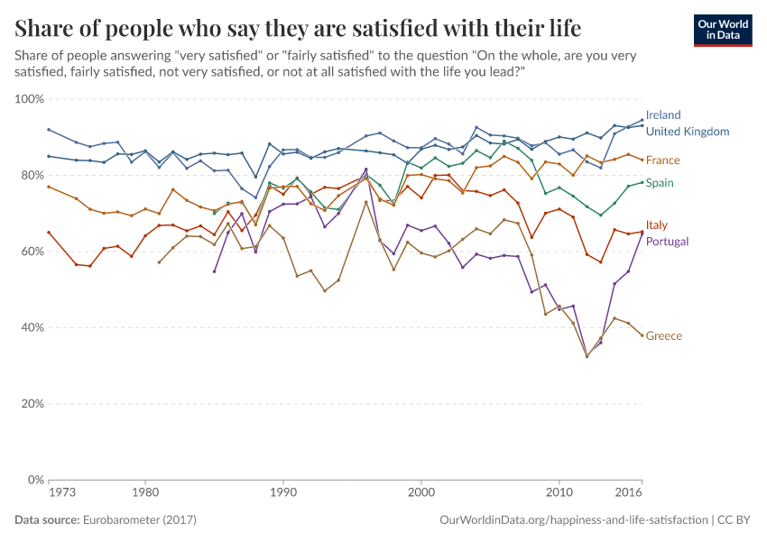 L'Eurobaromètre, sous l'égide de la Commission européenne, collecte depuis 1974 des données sur la satisfaction de vie au sein de grandes enquêtes d'opinion. Pour certains pays, ces enquêtes ont été menées annuellement depuis plus de 40 ans. Le graphique ci-dessous montre, comme précédemment, la part des personnes se disant “très satisfaites” ou “assez satisfaites” de leurs conditions de vie.