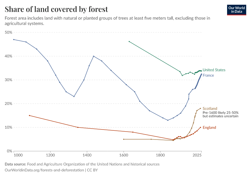 One thousand years ago, 20% of Scotland’s land was covered by forest. By the mid-18th century, only 4% of the country was forested. But then the trend turned, and it moved from deforestation to reforestation. For the last two centuries, forests have been growing and are almost back to where they were 1000 years ago.13