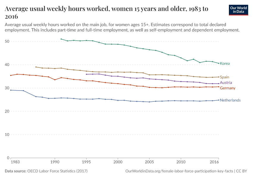 The chart here provides some clues. It shows average weekly hours worked by women in a selection of OECD countries over several decades. In most countries, average weekly hours fell over time, which is consistent with the trends for the population as a whole.