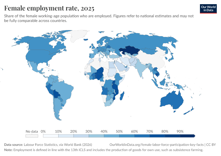 The chart here plots female employment-to-population ratios across the world (national estimates before ILO corrections). These figures show the number of employed women as a share of the total female working-age population (in both cases, for women ages 15 or older).