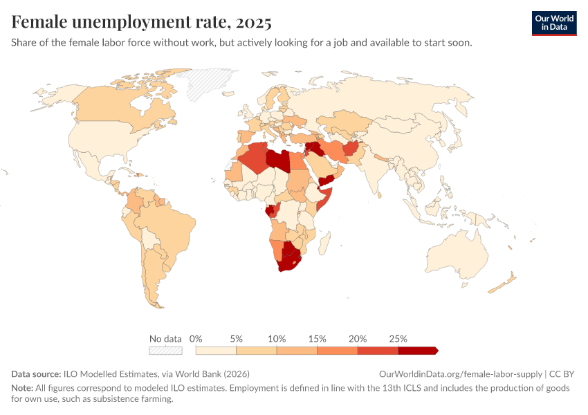 The map shows unemployment rates for women across the world. As we can see, the highest female unemployment rates are concentrated in North Africa and the Middle East, and correspond to the countries where female labor force participation is also low.