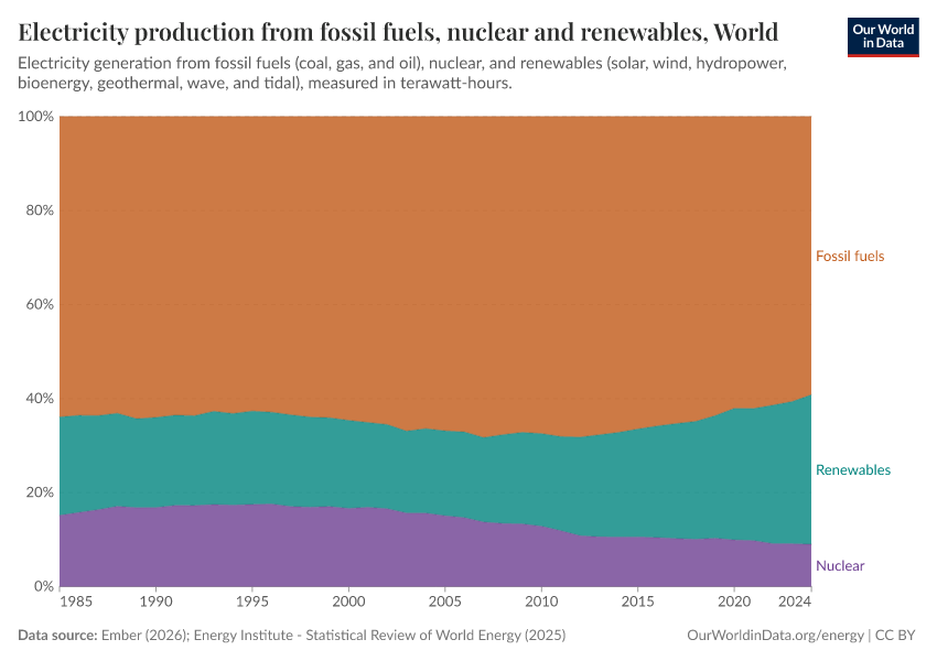 In the chart here we see trends in electricity production2 from renewable technologies, nuclear, and fossil fuels. These figures are given as the percentage contribution to total global electricity production.