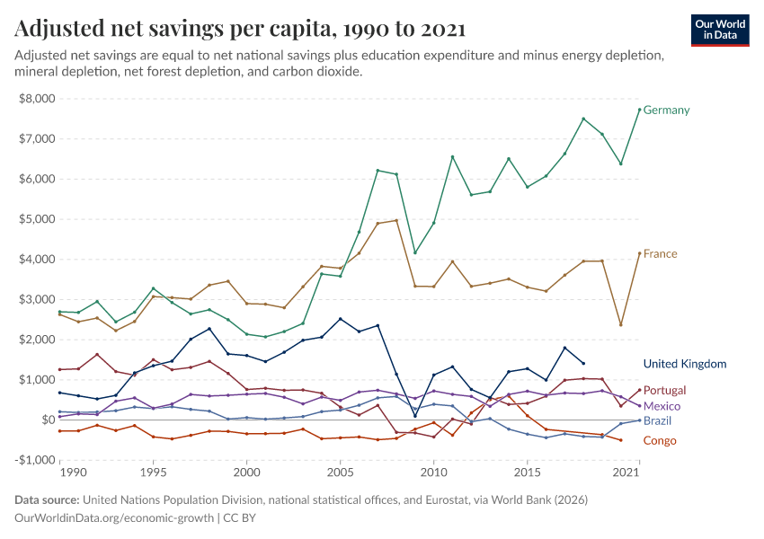 “Data Page: Adjusted net savings per capita”. Our World in Data (2026). Data adapted from United Nations Population Division, national statistical offices, and Eurostat, via World Bank. Retrieved from https://data-unoosa-launches.owid.pages.dev:8789/20260202-181317/grapher/adjusted-net-savings-per-person.html [online resource] (archived on February 2, 2026).How to cite this data