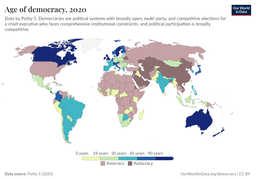 “Data Page: Age of democracy”, part of the following publication: Bastian Herre, Lucas Rodés-Guirao, and Esteban Ortiz-Ospina (2013) - “Democracy”. Data adapted from Polity 5. Retrieved from https://data-unoosa-launches.owid.pages.dev:8789/20260223-071105/grapher/age-of-democracy-polity.html [online resource] (archived on February 23, 2026).How to cite this data