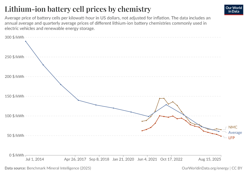 Benchmark Mineral Intelligence (2025) – with minor processing by Our World in Data. “Lithium-ion battery cell prices by chemistry” [dataset]. Benchmark Mineral Intelligence, “Lithium-ion battery prices”; Benchmark Mineral Intelligence, “Battery prices by chemistry” [original data]. Retrieved February 25, 2026 from https://data-unoosa-launches.owid.pages.dev:8789/20260108-171008/grapher/average-battery-cell-price.html (archived on January 8, 2026).