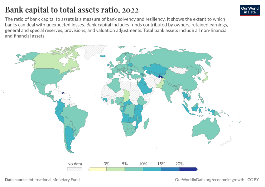 “Data Page: Bank capital to total assets ratio”. Our World in Data (2026). Data adapted from International Monetary Fund. Retrieved from https://data-unoosa-launches.owid.pages.dev:8789/20251120-211749/grapher/bank-capital-to-total-assets-ratio.html [online resource] (archived on November 20, 2025).How to cite this data