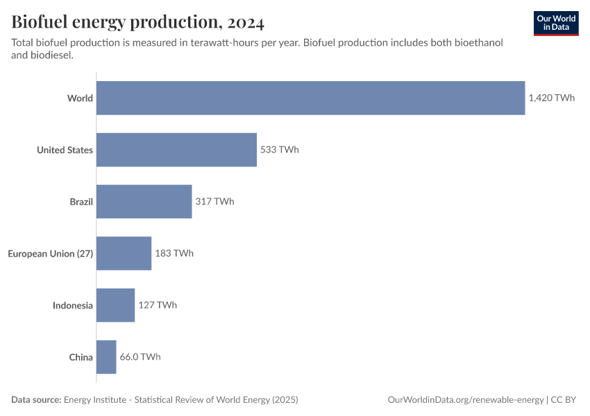 Energy Institute - Statistical Review of World Energy (2025) – with major processing by Our World in Data. “Biofuels production” [dataset]. Energy Institute, “Statistical Review of World Energy” [original data]. Retrieved February 25, 2026 from https://data-unoosa-launches.owid.pages.dev:8789/20260119-065148/grapher/biofuel-production.html (archived on January 19, 2026).
