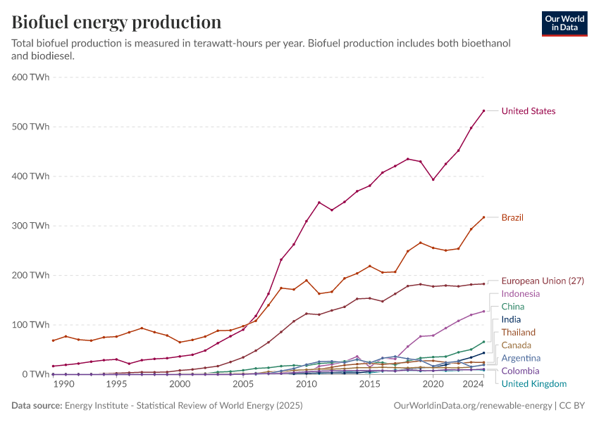Energy Institute - Statistical Review of World Energy (2025) – with major processing by Our World in Data. “Biofuels production” [dataset]. Energy Institute, “Statistical Review of World Energy” [original data]. Retrieved February 25, 2026 from https://data-unoosa-launches.owid.pages.dev:8789/20260119-065148/grapher/biofuel-production.html (archived on January 19, 2026).