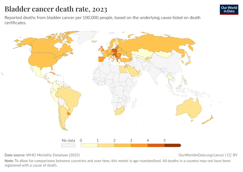 “Data Page: Bladder cancer death rate”, part of the following publication: Saloni Dattani, Fiona Spooner, Hannah Ritchie, and Max Roser (2023) - “Causes of Death”. Data adapted from WHO Mortality Database. Retrieved from https://data-unoosa-launches.owid.pages.dev:8789/20250909-093708/grapher/bladder-cancer-death-rate.html [online resource] (archived on September 9, 2025).How to cite this data