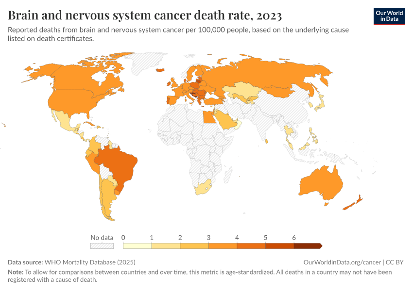 WHO Mortality Database (2025) – with minor processing by Our World in Data. “Brain and nervous system cancer death rate” [dataset]. WHO Mortality Database, “WHO Mortality Database” [original data]. Retrieved February 25, 2026 from https://data-unoosa-launches.owid.pages.dev:8789/20250909-093708/grapher/brain-and-nervous-system-cancer-death-rate.html (archived on September 9, 2025).