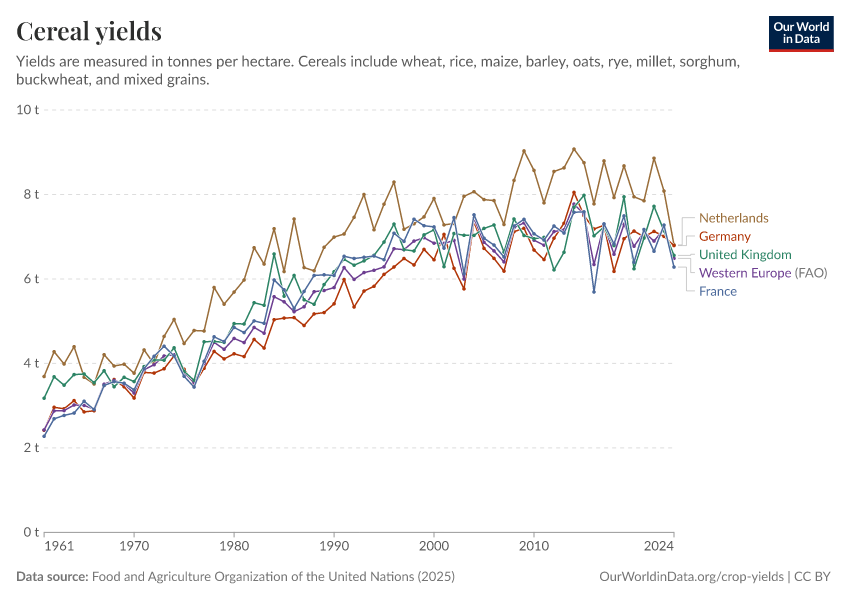 Food and Agriculture Organization of the United Nations (2025) – with major processing by Our World in Data. “Cereal yields – UN FAO” [dataset]. Food and Agriculture Organization of the United Nations, “Production: Crops and livestock products” [original data]. Retrieved February 25, 2026 from https://data-unoosa-launches.owid.pages.dev:8789/20260116-143329/grapher/cereal-yield.html (archived on January 16, 2026).