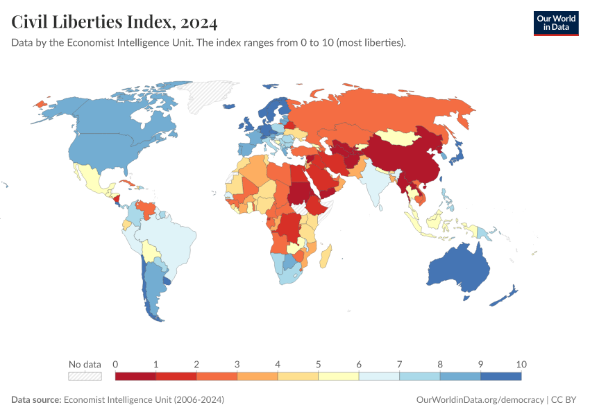 Economist Intelligence Unit (2006-2024) – processed by Our World in Data. “Civil Liberties Index” [dataset]. Economist Intelligence Unit, “Democracy Index 2021: The China challenge”; Economist Intelligence Unit, “Democracy Index 2022: Frontline democracy and the battle for Ukraine”; Economist Intelligence Unit, “Democracy Index 2023: Age of Conflict”; Economist Intelligence Unit, “Democracy Index 2024: What's wrong with representative democracy?”; Gapminder, “Democracy Index v4”; Various sources, “Population” [original data]. Retrieved February 25, 2026 from https://data-unoosa-launches.owid.pages.dev:8789/20260119-070102/grapher/civil-liberties-index-eiu.html (archived on January 19, 2026).