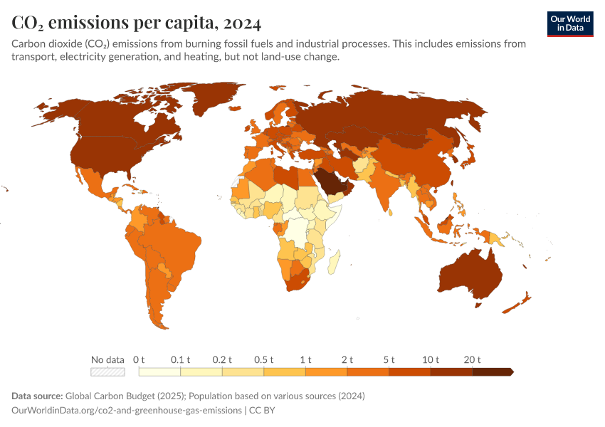 Global Carbon Budget (2025); Population based on various sources (2024) – with major processing by Our World in Data. “CO₂ emissions per capita” [dataset]. Global Carbon Project, “Global Carbon Budget v15”; Various sources, “Population” [original data]. Retrieved February 25, 2026 from https://data-unoosa-launches.owid.pages.dev:8789/20260119-070102/grapher/co-emissions-per-capita.html (archived on January 19, 2026).