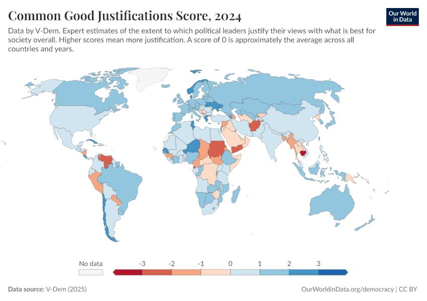 “Data Page: Common good justifications”, part of the following publication: Bastian Herre, Lucas Rodés-Guirao, and Esteban Ortiz-Ospina (2013) - “Democracy”. Data adapted from V-Dem. Retrieved from https://data-unoosa-launches.owid.pages.dev:8789/20260204-170225/grapher/common-good-justifications-score.html [online resource] (archived on February 4, 2026).How to cite this data