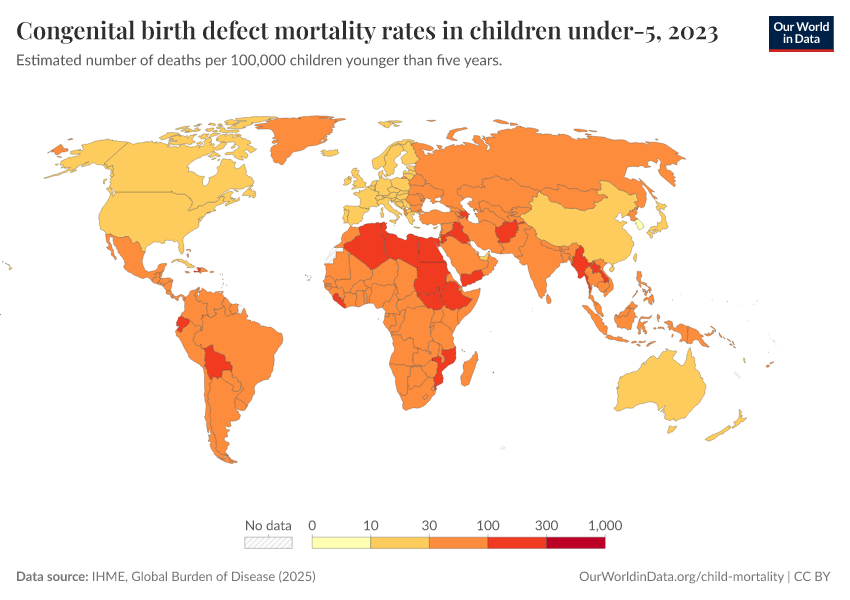 “Data Page: Congenital birth defect mortality rates in children under-5”, part of the following publication: Esteban Ortiz-Ospina and Max Roser (2016) - “Global Health”. Data adapted from IHME, Global Burden of Disease. Retrieved from https://data-unoosa-launches.owid.pages.dev:8789/20260211-174736/grapher/congenital-birth-defect-mortality-rates-in-children-under-5.html [online resource] (archived on February 11, 2026).How to cite this data