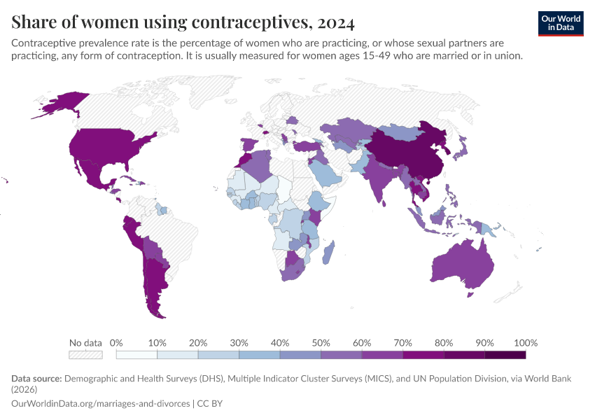 “Data Page: Share of women using contraceptives”. Our World in Data (2026). Data adapted from Demographic and Health Surveys (DHS), Multiple Indicator Cluster Surveys (MICS), and UN Population Division, via World Bank. Retrieved from https://data-unoosa-launches.owid.pages.dev:8789/20260202-181317/grapher/contraceptive-prevalence-any-methods-of-women-ages-15-49.html [online resource] (archived on February 2, 2026).How to cite this data