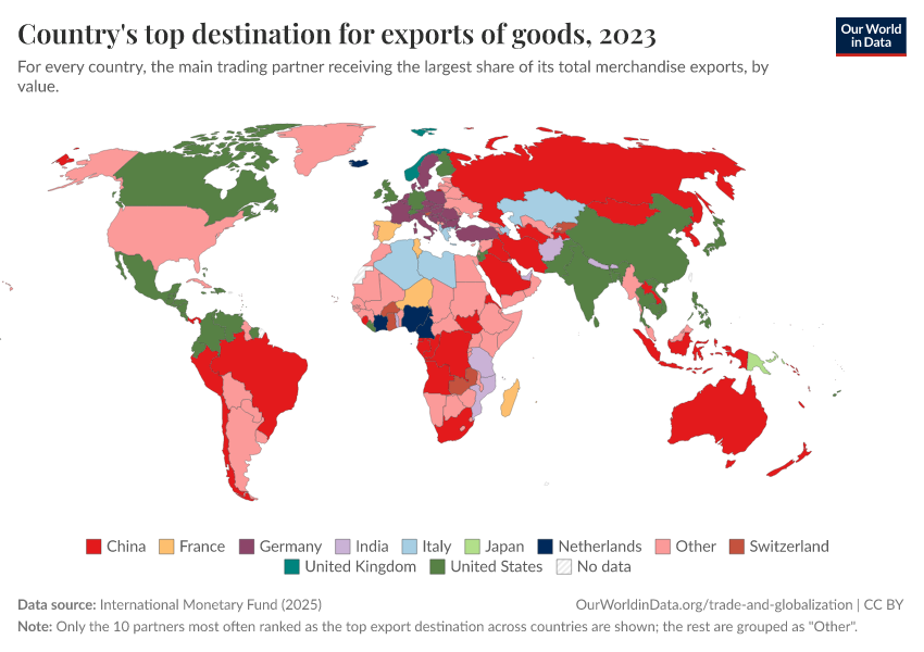 International Monetary Fund (2025) – with major processing by Our World in Data. “Top export partner category” [dataset]. International Monetary Fund, “International Trade in Goods (by partner country) (IMTS)” [original data]. Retrieved February 25, 2026 from https://data-unoosa-launches.owid.pages.dev:8789/20251114-012441/grapher/countrys-top-destination-for-exports-of-goods.html (archived on November 14, 2025).