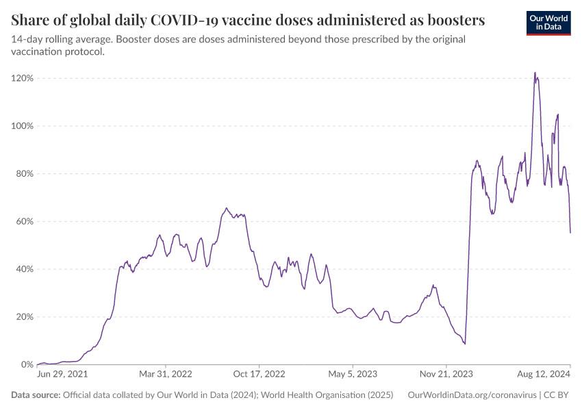 Official data collated by Our World in Data (2024); World Health Organisation (2025) – with major processing by Our World in Data. “Share of global daily COVID-19 vaccine doses administered as boosters” [dataset]. Official data collated by Our World in Data, “COVID-19, vaccinations”; World Health Organisation, “COVID-19, vaccinations (WHO)” [original data]. Retrieved February 25, 2026 from https://data-unoosa-launches.owid.pages.dev:8789/20250909-093708/grapher/covid-vaccine-share-boosters.html (archived on September 9, 2025).