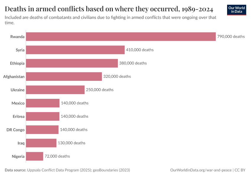 “Data Page: Deaths in armed conflicts based on where they occurred, 1989-2024”. Our World in Data (2026). Data adapted from Uppsala Conflict Data Program, Natural Earth. Retrieved from https://data-unoosa-launches.owid.pages.dev:8789/20250909-093708/grapher/cumulative-deaths-in-armed-conflicts.html [online resource] (archived on September 9, 2025).