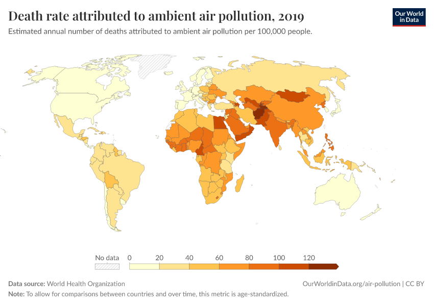 “Data Page: Death rate attributed to ambient air pollution”. Our World in Data (2026). Data adapted from World Health Organization. Retrieved from https://data-unoosa-launches.owid.pages.dev:8789/20260130-180113/grapher/death-rate-ambient-air-pollution.html [online resource] (archived on January 30, 2026).How to cite this data