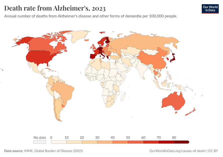 “Data Page: Death rate from Alzheimer's”, part of the following publication: Esteban Ortiz-Ospina and Max Roser (2016) - “Global Health”. Data adapted from IHME, Global Burden of Disease. Retrieved from https://data-unoosa-launches.owid.pages.dev:8789/20260211-174736/grapher/death-rate-from-alzheimers-other-dementias-gbd.html [online resource] (archived on February 11, 2026).How to cite this data