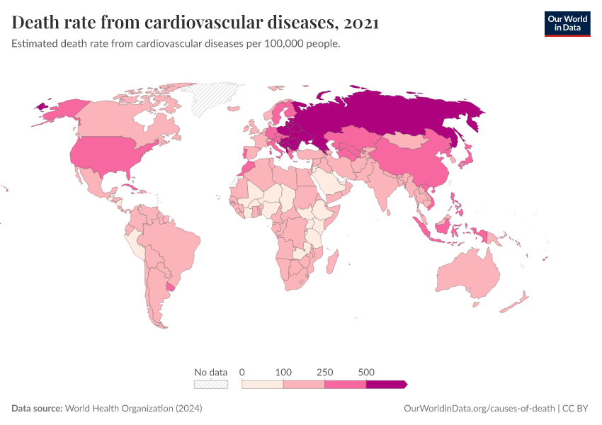 World Health Organization (2024) – with major processing by Our World in Data. “Death rate from cardiovascular diseases” [dataset]. World Health Organization, “Global Health Estimates” [original data]. Retrieved February 25, 2026 from https://data-unoosa-launches.owid.pages.dev:8789/20250909-093708/grapher/death-rate-from-cardiovascular-disease-ghe.html (archived on September 9, 2025).