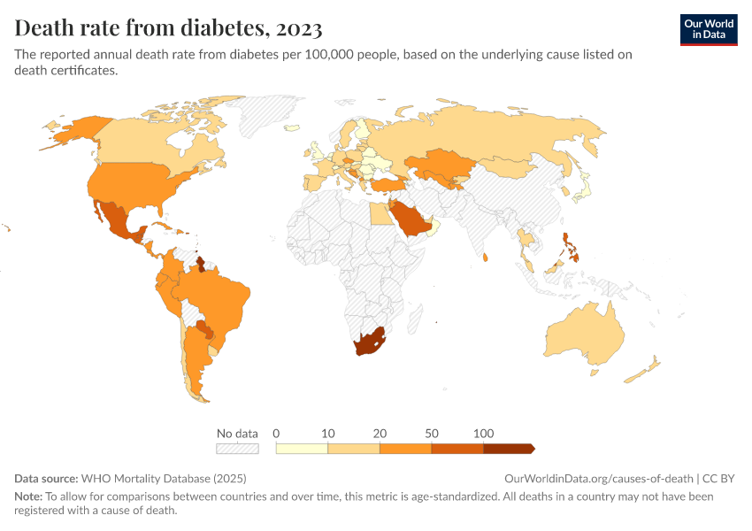 WHO Mortality Database (2025) – with minor processing by Our World in Data. “Death rate from diabetes” [dataset]. WHO Mortality Database, “WHO Mortality Database” [original data]. Retrieved February 25, 2026 from https://data-unoosa-launches.owid.pages.dev:8789/20250909-093708/grapher/death-rate-from-diabetes-who-mdb.html (archived on September 9, 2025).