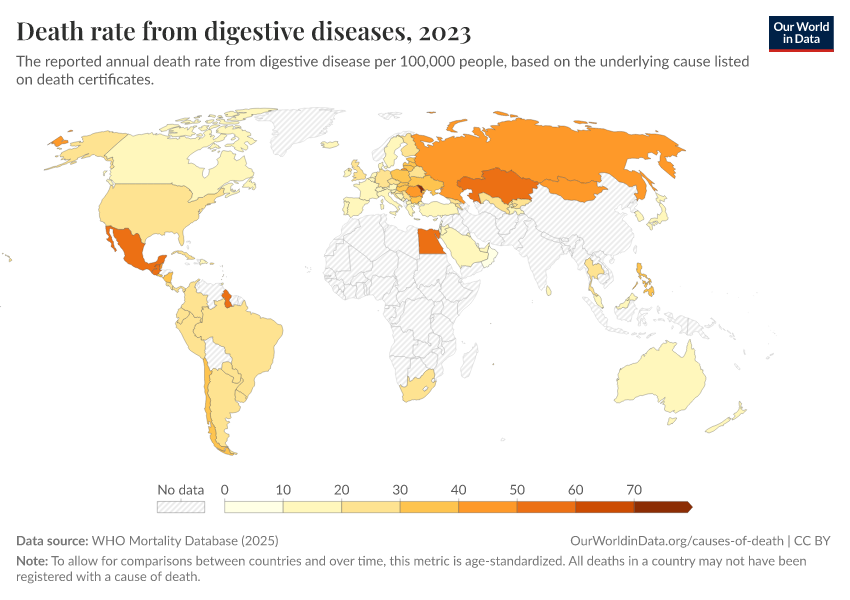 WHO Mortality Database (2025) – with minor processing by Our World in Data. “Death rate from digestive diseases” [dataset]. WHO Mortality Database, “WHO Mortality Database” [original data]. Retrieved February 25, 2026 from https://data-unoosa-launches.owid.pages.dev:8789/20250909-093708/grapher/death-rate-from-digestive-diseases-who-mdb.html (archived on September 9, 2025).