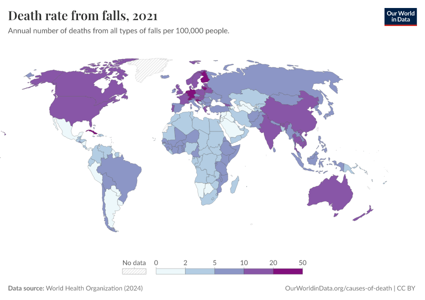 World Health Organization (2024) – with major processing by Our World in Data. “Death rate from falls” [dataset]. World Health Organization, “Global Health Estimates” [original data]. Retrieved February 25, 2026 from https://data-unoosa-launches.owid.pages.dev:8789/20250909-093708/grapher/death-rate-from-falls.html (archived on September 9, 2025).