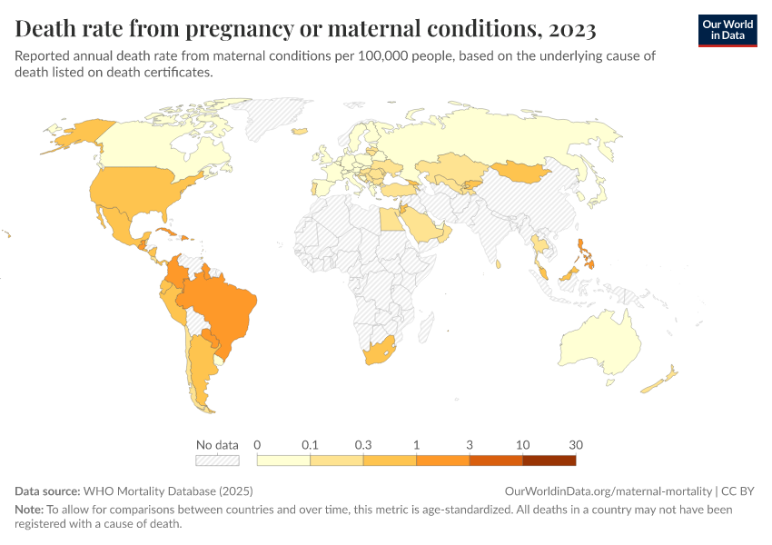 WHO Mortality Database (2025) – with minor processing by Our World in Data. “Death rate from pregnancy or maternal conditions” [dataset]. WHO Mortality Database, “WHO Mortality Database” [original data]. Retrieved February 25, 2026 from https://data-unoosa-launches.owid.pages.dev:8789/20250909-093708/grapher/death-rate-from-maternal-disorders.html (archived on September 9, 2025).