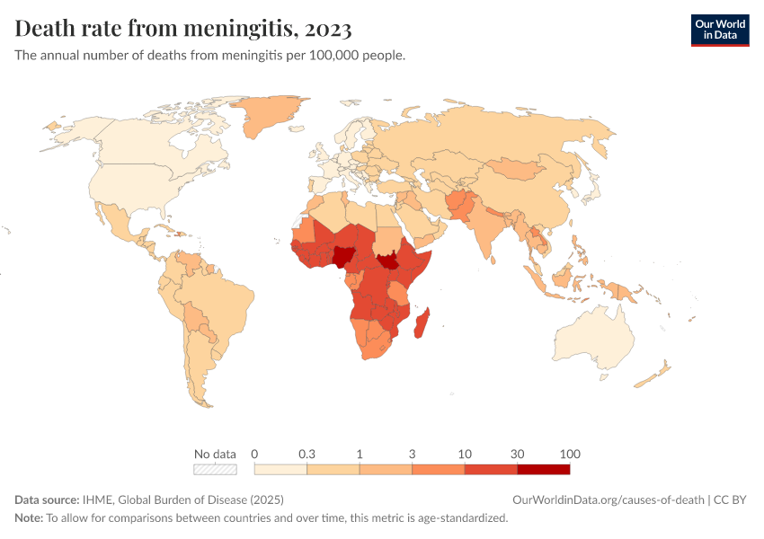 IHME, Global Burden of Disease (2025) – with major processing by Our World in Data. “Death rate from meningitis” [dataset]. IHME, Global Burden of Disease, “Global Burden of Disease - Deaths” [original data]. Retrieved February 25, 2026 from https://data-unoosa-launches.owid.pages.dev:8789/20260211-174736/grapher/death-rate-from-meningitis.html (archived on February 11, 2026).