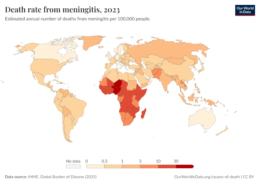 “Data Page: Death rate from meningitis”, part of the following publication: Esteban Ortiz-Ospina and Max Roser (2016) - “Global Health”. Data adapted from IHME, Global Burden of Disease. Retrieved from https://data-unoosa-launches.owid.pages.dev:8789/20260211-174736/grapher/death-rate-from-meningitis-gbd.html [online resource] (archived on February 11, 2026).How to cite this data