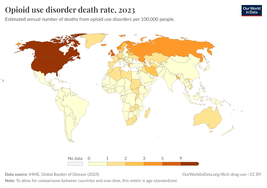 “Data Page: Opioid use disorder death rate”, part of the following publication: Esteban Ortiz-Ospina and Max Roser (2016) - “Global Health”. Data adapted from IHME, Global Burden of Disease. Retrieved from https://data-unoosa-launches.owid.pages.dev:8789/20260211-174736/grapher/death-rate-from-opioid-use.html [online resource] (archived on February 11, 2026).How to cite this data