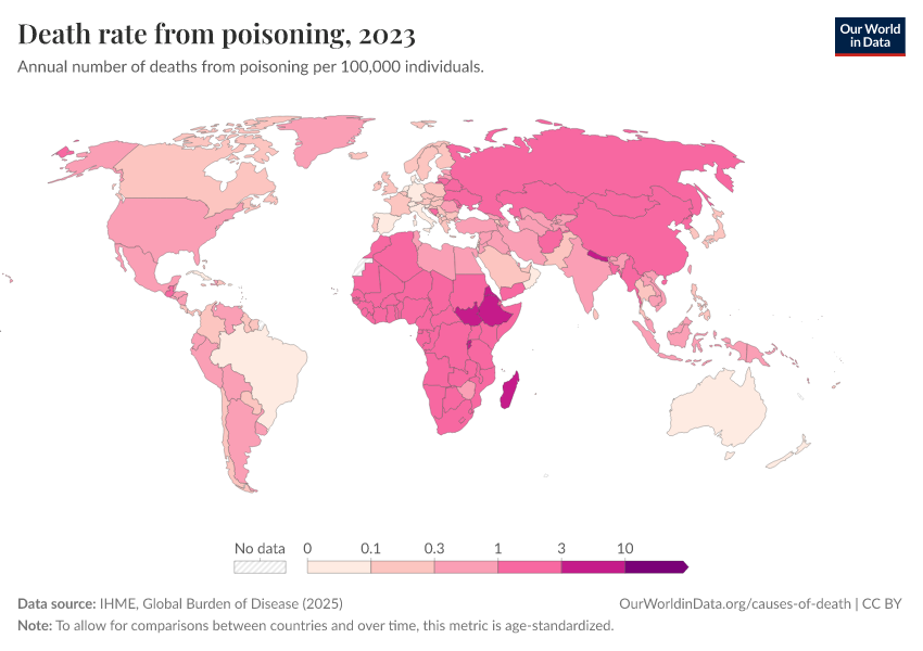 IHME, Global Burden of Disease (2025) – with major processing by Our World in Data. “Death rate from poisoning” [dataset]. IHME, Global Burden of Disease, “Global Burden of Disease - Deaths” [original data]. Retrieved February 25, 2026 from https://data-unoosa-launches.owid.pages.dev:8789/20260211-174736/grapher/death-rate-from-poisoning.html (archived on February 11, 2026).