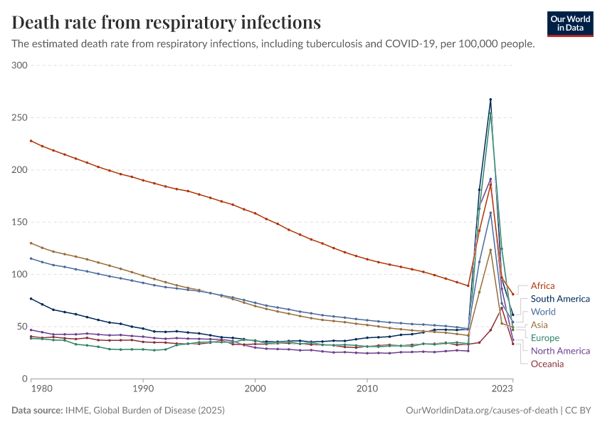 IHME, Global Burden of Disease (2025) – with major processing by Our World in Data. “Death rate from respiratory infections” [dataset]. IHME, Global Burden of Disease, “Global Burden of Disease - Deaths” [original data]. Retrieved February 25, 2026 from https://data-unoosa-launches.owid.pages.dev:8789/20260211-174736/grapher/death-rate-from-respiratory-infections-gbd.html (archived on February 11, 2026).