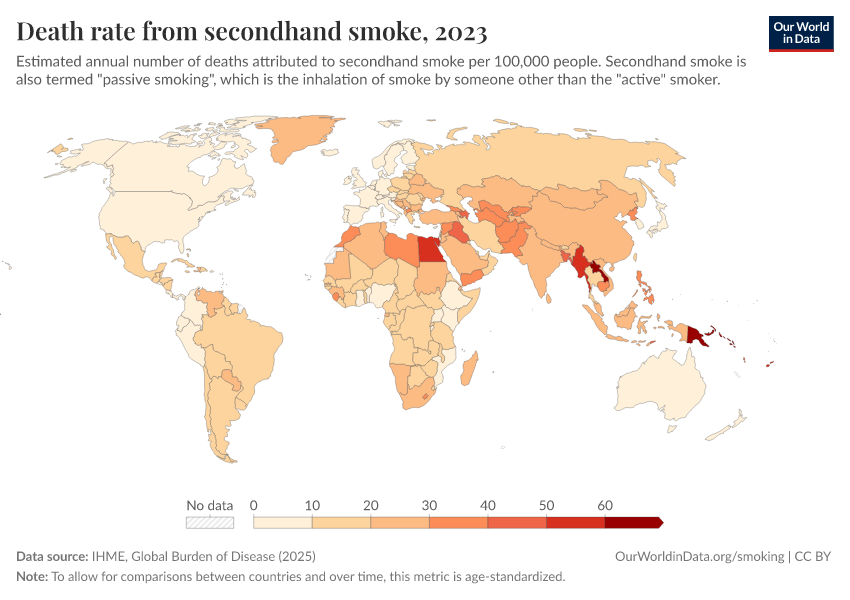 IHME, Global Burden of Disease (2025) – with major processing by Our World in Data. “Death rate from secondhand smoke” [dataset]. IHME, Global Burden of Disease, “Global Burden of Disease - Risk Factors - Deaths” [original data]. Retrieved February 25, 2026 from https://data-unoosa-launches.owid.pages.dev:8789/20260213-113303/grapher/death-rate-from-secondhand-smoke.html (archived on February 13, 2026).