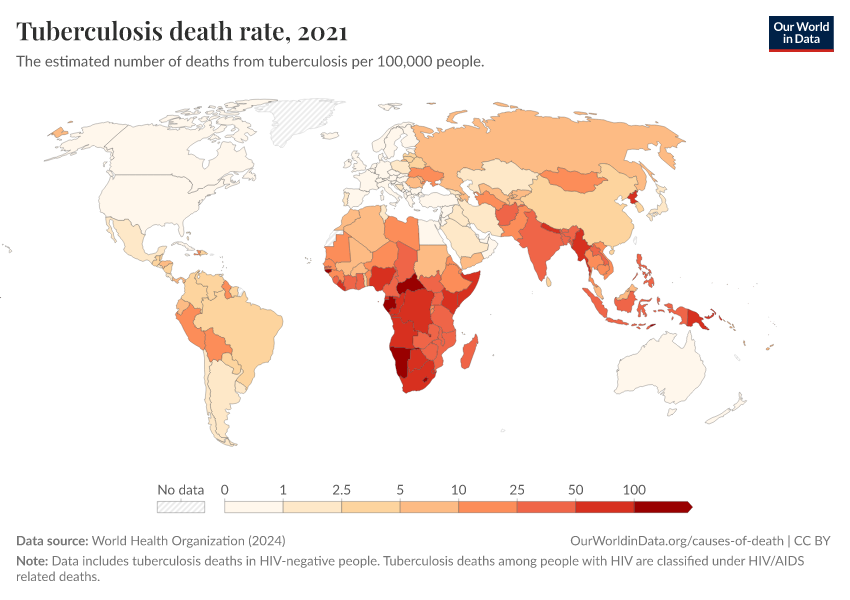 World Health Organization (2024) – with major processing by Our World in Data. “Tuberculosis death rate” [dataset]. World Health Organization, “Global Health Estimates” [original data]. Retrieved February 25, 2026 from https://data-unoosa-launches.owid.pages.dev:8789/20250909-093708/grapher/death-rate-from-tuberculosis-ghe.html (archived on September 9, 2025).