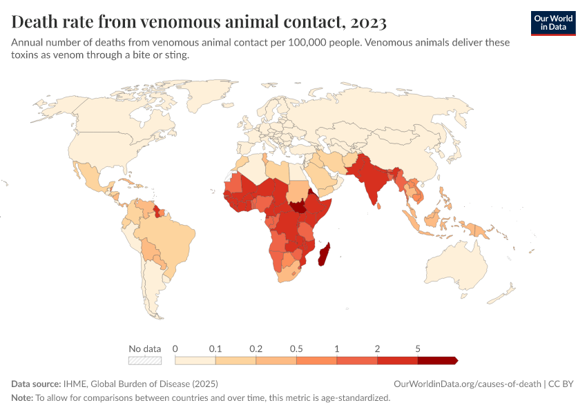IHME, Global Burden of Disease (2025) – with major processing by Our World in Data. “Death rate from venomous animal contact” [dataset]. IHME, Global Burden of Disease, “Global Burden of Disease - Deaths” [original data]. Retrieved February 25, 2026 from https://data-unoosa-launches.owid.pages.dev:8789/20260211-174736/grapher/death-rate-from-venomous-animal.html (archived on February 11, 2026).