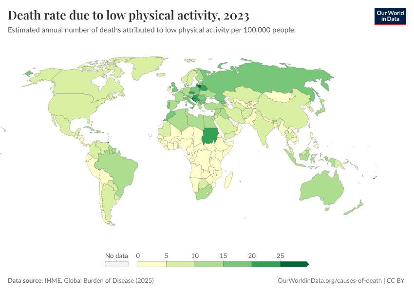 “Data Page: Death rate due to low physical activity”, part of the following publication: Esteban Ortiz-Ospina and Max Roser (2016) - “Global Health”. Data adapted from IHME, Global Burden of Disease. Retrieved from https://data-unoosa-launches.owid.pages.dev:8789/20260213-112438/grapher/death-rates-due-to-low-physical-activity-gbd.html [online resource] (archived on February 13, 2026).How to cite this data