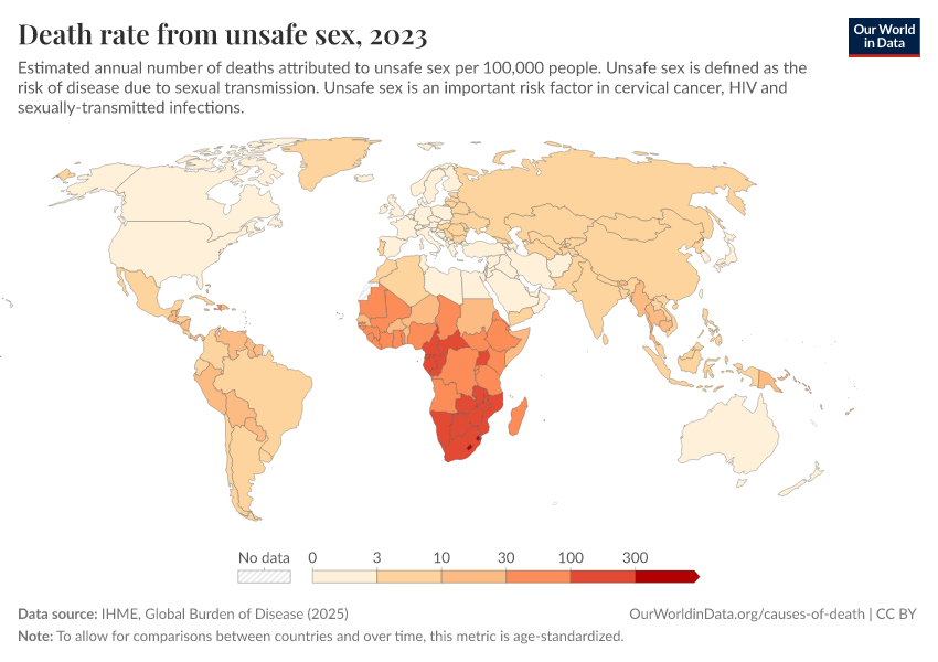 IHME, Global Burden of Disease (2025) – with major processing by Our World in Data. “Death rate from unsafe sex” [dataset]. IHME, Global Burden of Disease, “Global Burden of Disease - Risk Factors - Deaths” [original data]. Retrieved February 25, 2026 from https://data-unoosa-launches.owid.pages.dev:8789/20260213-113303/grapher/death-rates-from-unsafe-sex.html (archived on February 13, 2026).