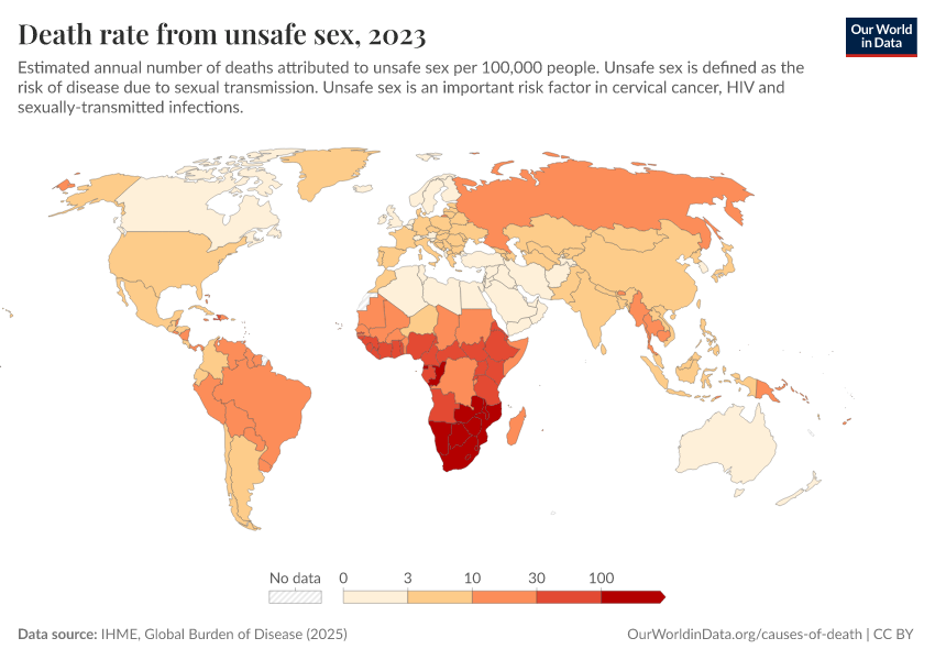 “Data Page: Death rate from unsafe sex”, part of the following publication: Esteban Ortiz-Ospina and Max Roser (2016) - “Global Health”. Data adapted from IHME, Global Burden of Disease. Retrieved from https://data-unoosa-launches.owid.pages.dev:8789/20260213-113303/grapher/death-rates-from-unsafe-sex-gbd.html [online resource] (archived on February 13, 2026).How to cite this data