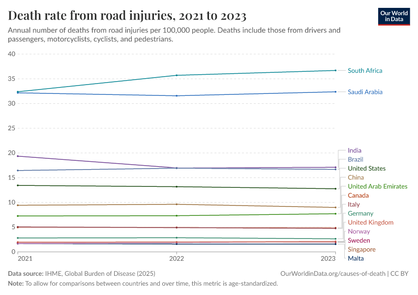 IHME, Global Burden of Disease (2025) – with major processing by Our World in Data. “Death rate from road injuries” [dataset]. IHME, Global Burden of Disease, “Global Burden of Disease - Deaths” [original data]. Retrieved February 25, 2026 from https://data-unoosa-launches.owid.pages.dev:8789/20260211-173942/grapher/death-rates-road-incidents.html (archived on February 11, 2026).