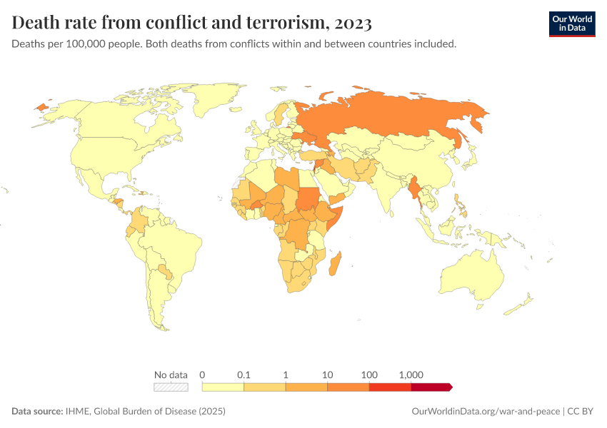 IHME, Global Burden of Disease (2025) – with major processing by Our World in Data. “Death rate from conflict and terrorism” [dataset]. IHME, Global Burden of Disease, “Global Burden of Disease - Deaths” [original data]. Retrieved February 25, 2026 from https://data-unoosa-launches.owid.pages.dev:8789/20260211-173942/grapher/deaths-conflict-terrorism-per-100000.html (archived on February 11, 2026).