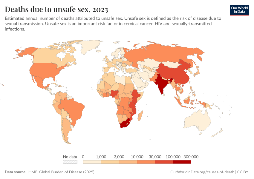 IHME, Global Burden of Disease (2025) – with major processing by Our World in Data. “Deaths due to unsafe sex” [dataset]. IHME, Global Burden of Disease, “Global Burden of Disease - Risk Factors - Deaths” [original data]. Retrieved February 25, 2026 from https://data-unoosa-launches.owid.pages.dev:8789/20260213-112438/grapher/deaths-due-to-unsafe-sex.html (archived on February 13, 2026).