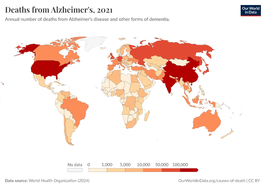 World Health Organization (2024) – with major processing by Our World in Data. “Deaths from Alzheimer's” [dataset]. World Health Organization, “Global Health Estimates” [original data]. Retrieved February 25, 2026 from https://data-unoosa-launches.owid.pages.dev:8789/20250909-093708/grapher/deaths-from-alzheimers-other-dementias.html (archived on September 9, 2025).
