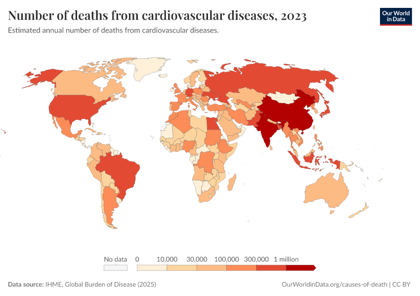 “Data Page: Number of deaths from cardiovascular diseases”, part of the following publication: Esteban Ortiz-Ospina and Max Roser (2016) - “Global Health”. Data adapted from IHME, Global Burden of Disease. Retrieved from https://data-unoosa-launches.owid.pages.dev:8789/20260211-174736/grapher/deaths-from-cardiovascular-disease.html [online resource] (archived on February 11, 2026).How to cite this data