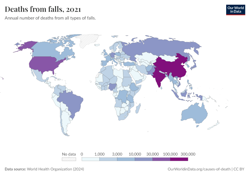 World Health Organization (2024) – with major processing by Our World in Data. “Deaths from falls” [dataset]. World Health Organization, “Global Health Estimates” [original data]. Retrieved February 25, 2026 from https://data-unoosa-launches.owid.pages.dev:8789/20250909-093708/grapher/deaths-from-falls.html (archived on September 9, 2025).