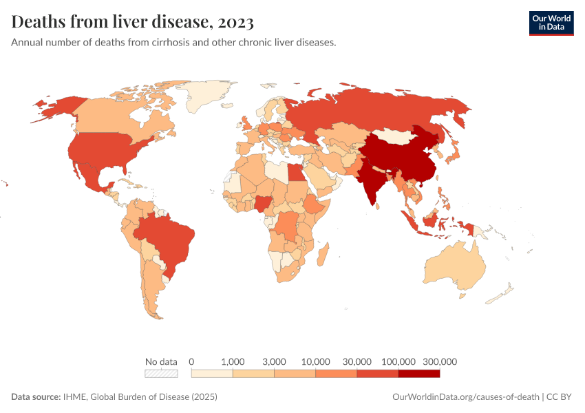 “Data Page: Deaths from liver disease”, part of the following publication: Esteban Ortiz-Ospina and Max Roser (2016) - “Global Health”. Data adapted from IHME, Global Burden of Disease. Retrieved from https://data-unoosa-launches.owid.pages.dev:8789/20260211-174736/grapher/deaths-from-liver-disease.html [online resource] (archived on February 11, 2026).How to cite this data