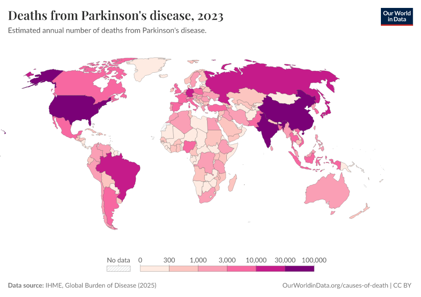 IHME, Global Burden of Disease (2025) – with major processing by Our World in Data. “Deaths from Parkinson's disease” [dataset]. IHME, Global Burden of Disease, “Global Burden of Disease - Deaths” [original data]. Retrieved February 25, 2026 from https://data-unoosa-launches.owid.pages.dev:8789/20260211-174736/grapher/deaths-from-parkinsons-disease.html (archived on February 11, 2026).